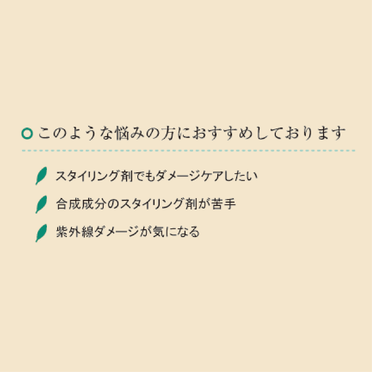 パーマ・カラーリングなどで傷んだ髪に天然のトリートメント成分でうるおいを与え、なめらかな手触りとツヤを出します。植物抽出エキス配合により、パサつき、枝毛、毛先の絡みを防ぎます。